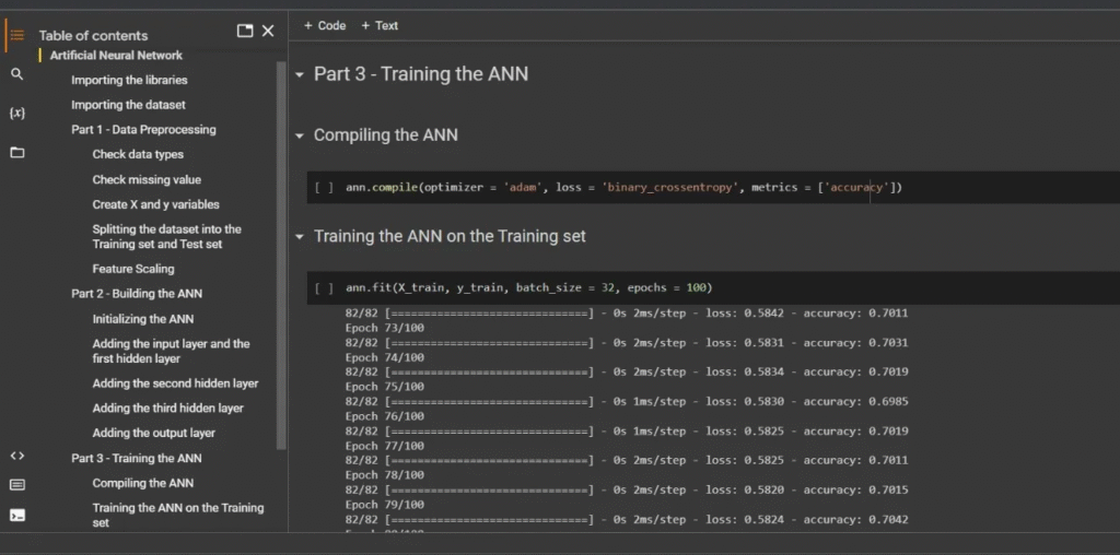 Proyek ini menerapkan Artificial Neural Network (ANN) untuk mengatasi masalah klasifikasi yang kompleks, yaitu mendeteksi kualitas air (layak atau tidak layak konsumsi) dari data sampel CSV. Setelah melalui tahapan data preprocessing dan pembangunan struktur ANN yang berlapis (deep learning), model dilatih menggunakan optimizer Adam selama 100 epochs.