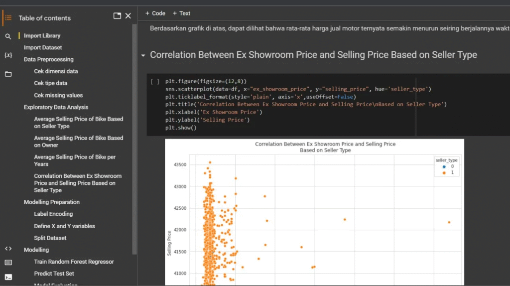 Proyek ini menggunakan Random Forest Regressor dalam Python untuk memprediksi harga jual motor bekas secara akurat. Kami melakukan data cleaning dan analisis korelasi harga jual terhadap faktor-faktor seperti harga awal dan jenis penjual untuk menghasilkan model prediksi harga yang optimal.