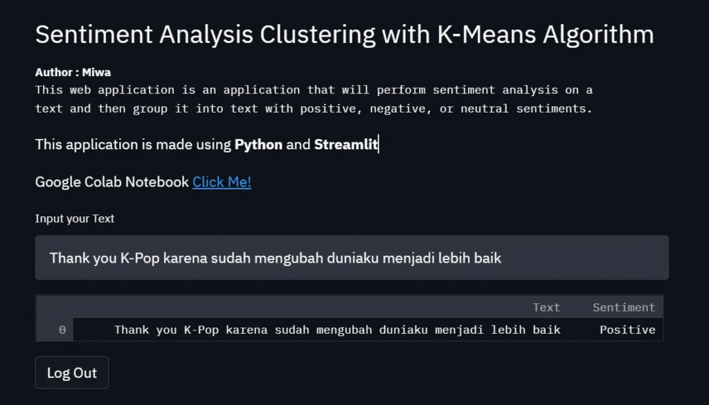 Proyek ini adalah pengembangan Aplikasi Web Streamlit menggunakan Python yang mampu melakukan Klasterisasi Analisis Sentimen secara real-time. Aplikasi ini menerapkan algoritma unsupervised learning K-Means untuk mengelompokkan teks input menjadi sentimen (Positif, Negatif, Netral) secara otomatis. Solusi ini memberikan platform interaktif dan user-friendly bagi klien untuk mendapatkan wawasan sentimen dari data teks instan.