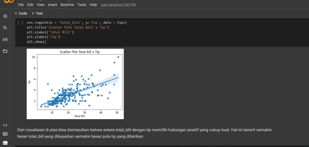 Kami menganalisis data untuk membuktikan bahwa ada hubungan positif yang kuat: semakin tinggi tagihan pelanggan, semakin besar tip yang diberikan. Ini menunjukkan bahwa strategi harga dapat langsung memengaruhi total pendapatan.