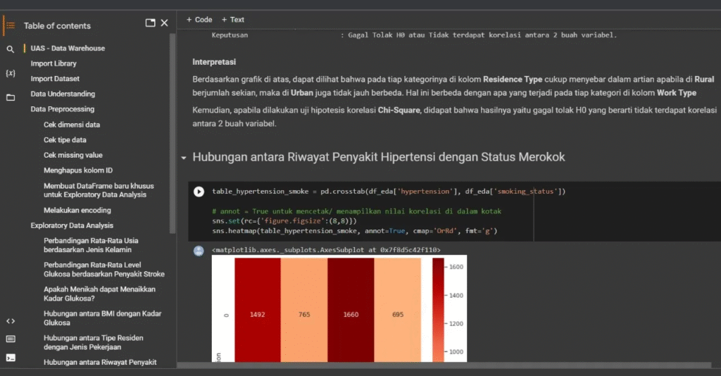 berfokus pada pembersihan dan eksplorasi data kesehatan, menguji korelasi statistik antara faktor gaya hidup dan riwayat penyakit (termasuk status merokok dan hipertensi), serta mengidentifikasi variabel yang berpengaruh untuk persiapan pembangunan model prediksi yang akurat.