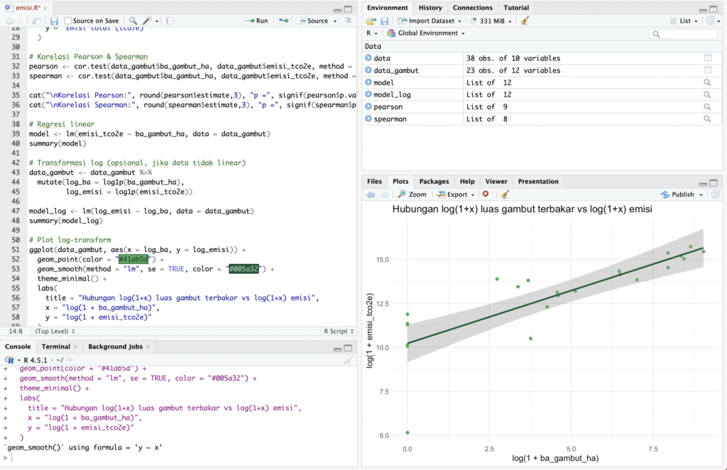 Proyek ini bertujuan untuk memodelkan hubungan antara luas gambut yang terbakar dan tingkat emisi dengan menggunakan uji korelasi Pearson/Spearman dan Regresi Linier setelah data variabel diubah ke bentuk logaritma. Hasilnya, yang ditampilkan dalam plot dengan garis regresi, mengkonfirmasi adanya hubungan positif yang signifikan antara luas lahan gambut terbakar dan emisi yang dihasilkan.