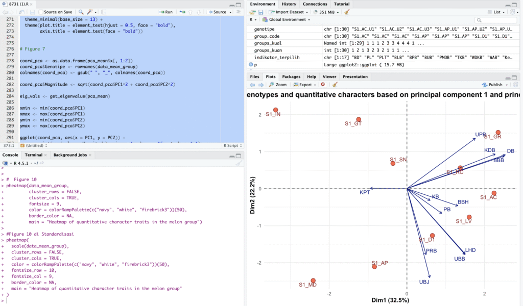 Proyek ini menjalankan analisis multivariat komprehensif (Multiple Correspondence Analysis/MCA untuk data kualitatif dan Principal Component Analysis/PCA untuk data kuantitatif) yang dilanjutkan dengan Klasterisasi Hierarki untuk mengelompokkan genotipe menjadi empat kelompok, kemudian memvisualisasikan hasilnya secara ekstensif.