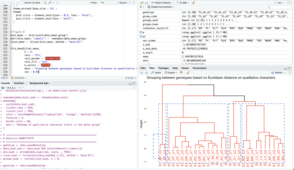 Kode R ini menjalankan analisis multivariat komprehensif (Multiple Correspondence Analysis/MCA untuk data kualitatif dan Principal Component Analysis/PCA untuk data kuantitatif) yang dilanjutkan dengan Klasterisasi Hierarki untuk mengelompokkan genotipe menjadi empat kelompok, kemudian memvisualisasikan hasilnya secara ekstensif.