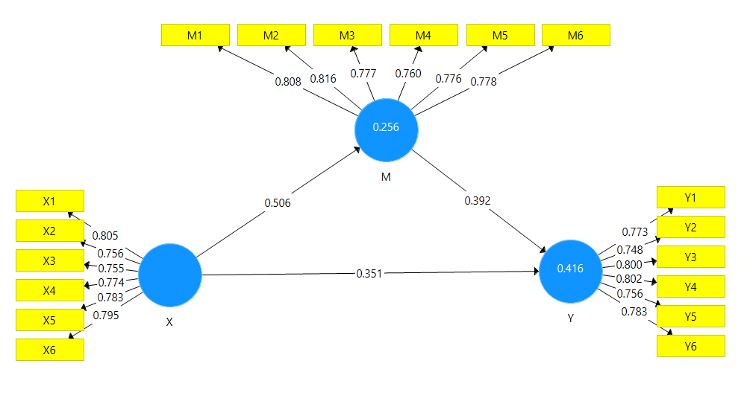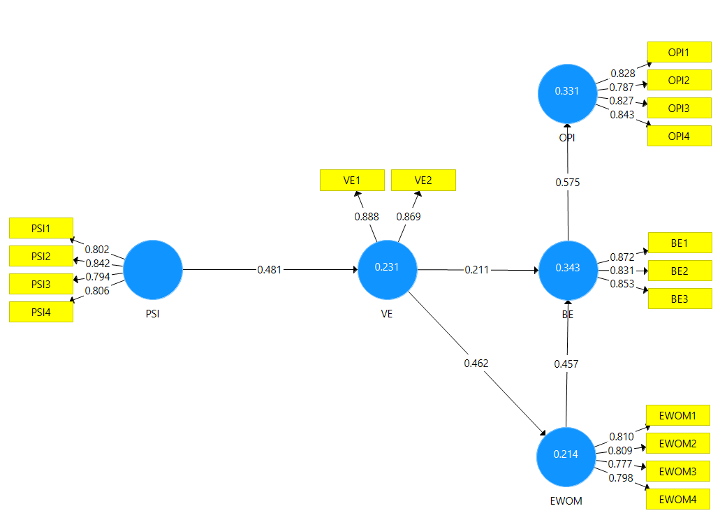 Proyek ini menganalisis model mediasi kompleks di mana Interaksi Parasosial (PSI), Ekspresi Viskarius (VE), dan Efek Bandwagon (BE) secara berantai memengaruhi Niat Pembelian Daring (OPI). Semua instrumen penelitian terbukti valid dan terpercaya. Hasilnya menunjukkan bahwa semua hubungan langsung dan semua jalur mediasi berantai yang diuji terbukti positif dan signifikan, menegaskan adanya pengaruh berlapis dari faktor-faktor sosial dan psikologis terhadap niat beli konsumen.