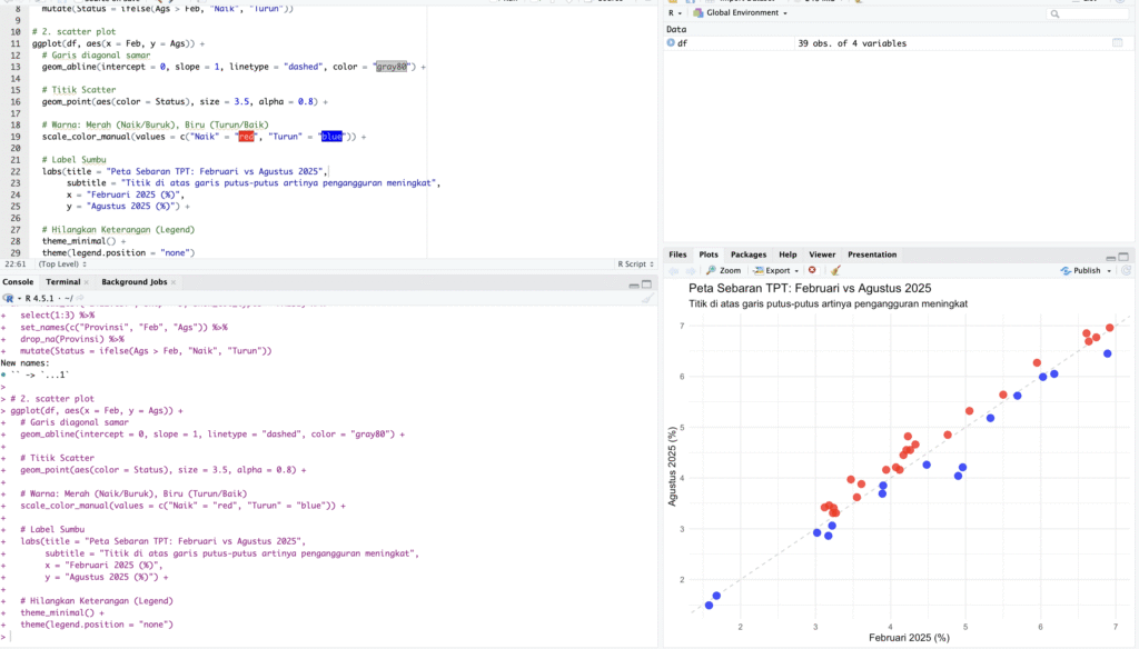Proyek ini memvisualisasikan data Tingkat Pengangguran Terbuka (TPT) 38 provinsi melalui Scatter Plot Diagonal. Analisis menunjukkan polarisasi tren pasar kerja provinsi-provinsi dengan TPT tinggi seperti DKI Jakarta menunjukkan perbaikan (titik di bawah garis diagonal), sementara Jawa Barat dan Banten menghadapi kenaikan marginal (titik di atas garis).